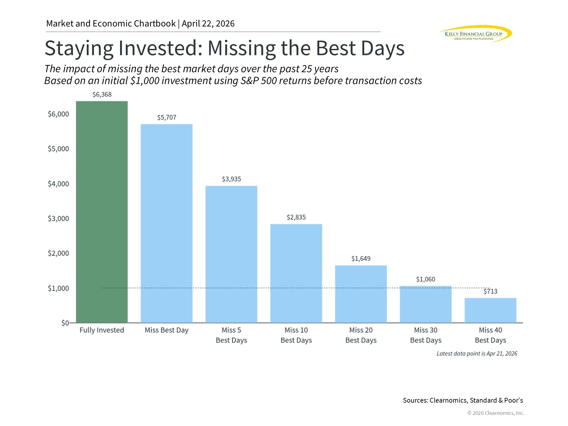 This same dynamic played out last year, when the S&P 500 fell nearly 19% at its worst point due to tariffs. Many investors feared that a sustained downturn and recession were inevitable. Fortunately, neither occurred and markets recovered over the following months. Those who stayed invested were rewarded. This is shown in the following chart, which highlights the difference between sticking to a plan and inadvertently missing positive market days.