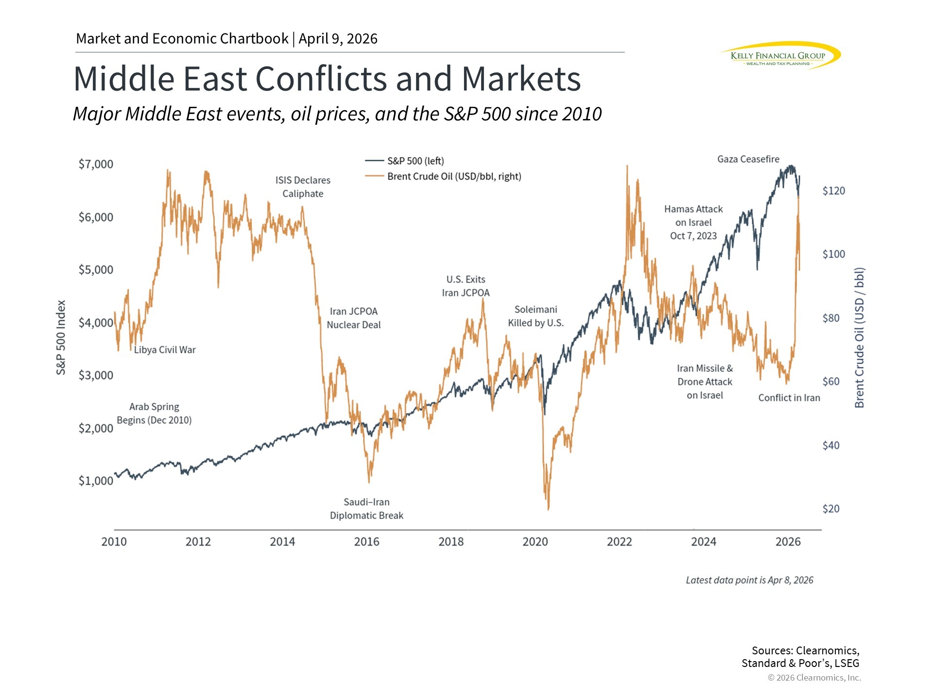 The included chart on Middle East conflicts and markets illustrates how geopolitical events have historically caused short-term volatility but rarely derailed long-term market performance, which is directly relevant here given the ongoing uncertainty around this ceasefire.